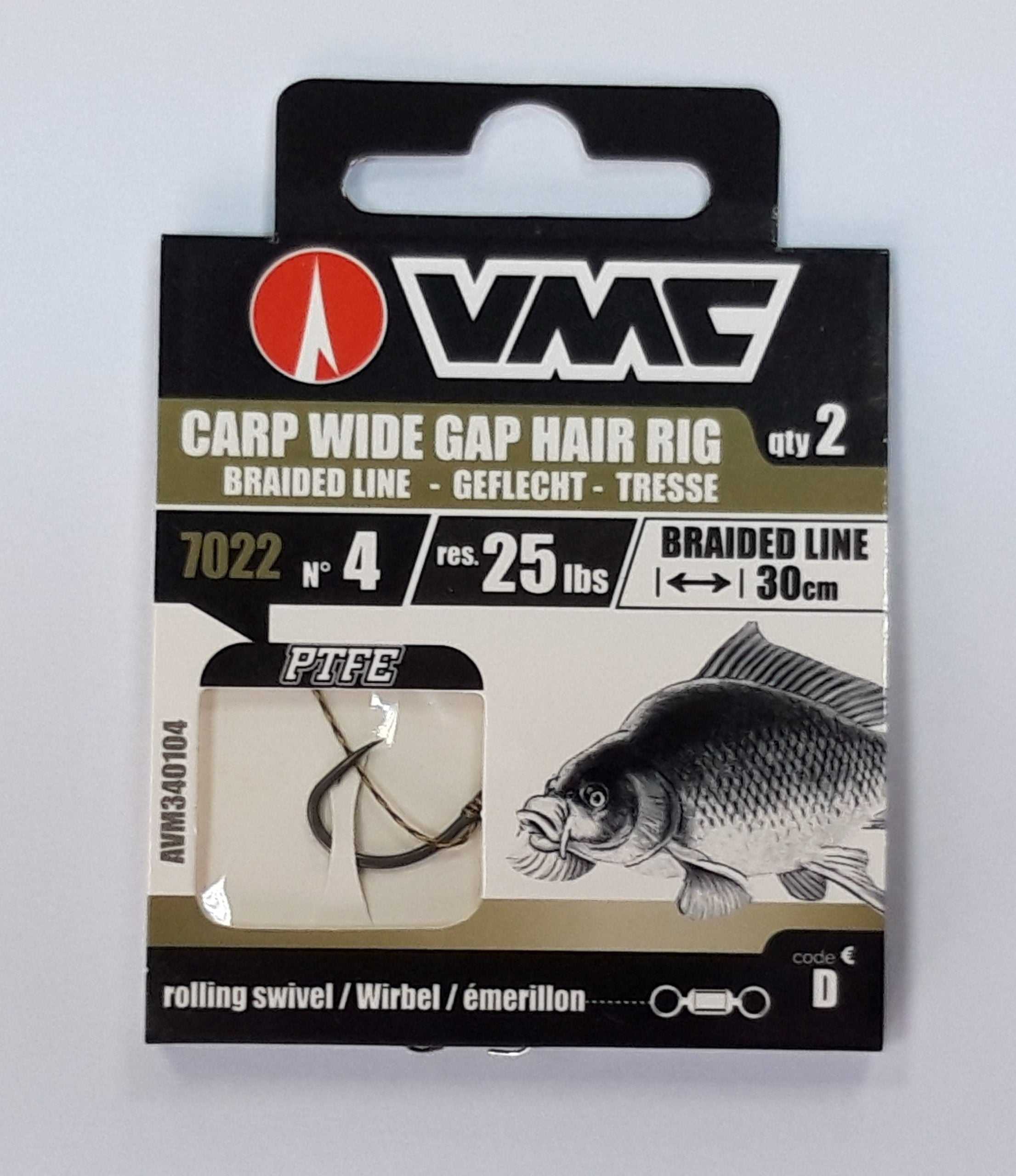 Carlige VMC legate - 7022 P.T.F.E. 4 x2 + fir textil 30cm + vartej\n- finisaj PTFE- marime:4- cantitate:2buc/plic- legate cu fir textil de 25lb si lungime 30 cm + vartej