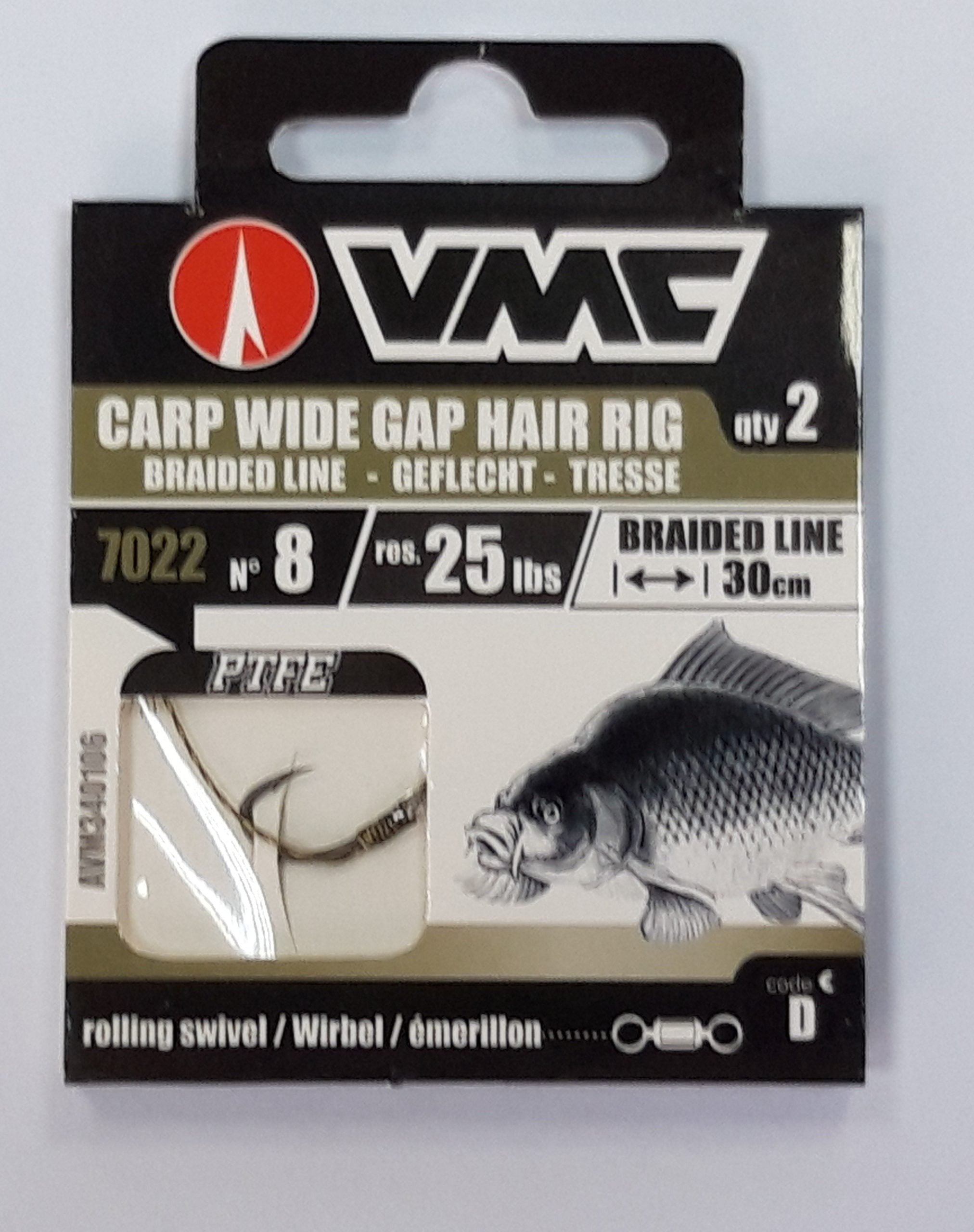 Carlige VMC legate - 7022 P.T.F.E. 8 x2 + fir textil 30cm + vartej\n- finisaj PTFE- marime:8- cantitate:2buc/plic- legate cu fir textil de 25lb si lungime 30 cm + vartej